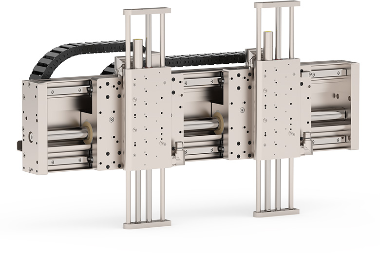 Le système se compose d’un module de base FM01 ou EM01 robuste pour une rigidité accrue ainsi que d’un module vertical DM03. Cette combinaison permet des applications de portique configurables de manière flexible avec des séquences de mouvements dynamiques et une grande précision de positionnement. Tous les axes peuvent être commandés et paramétrés indépendamment les uns des autres.